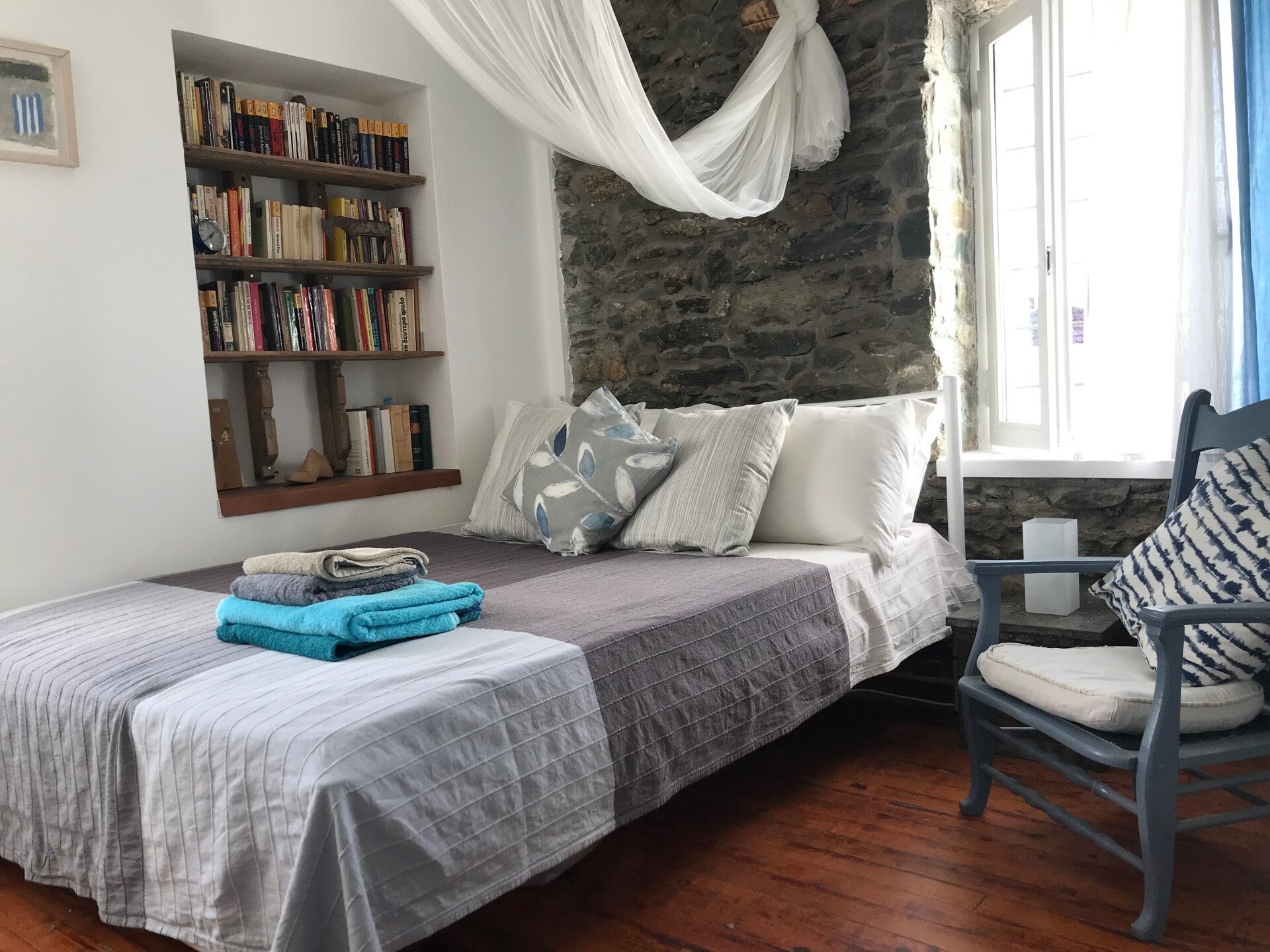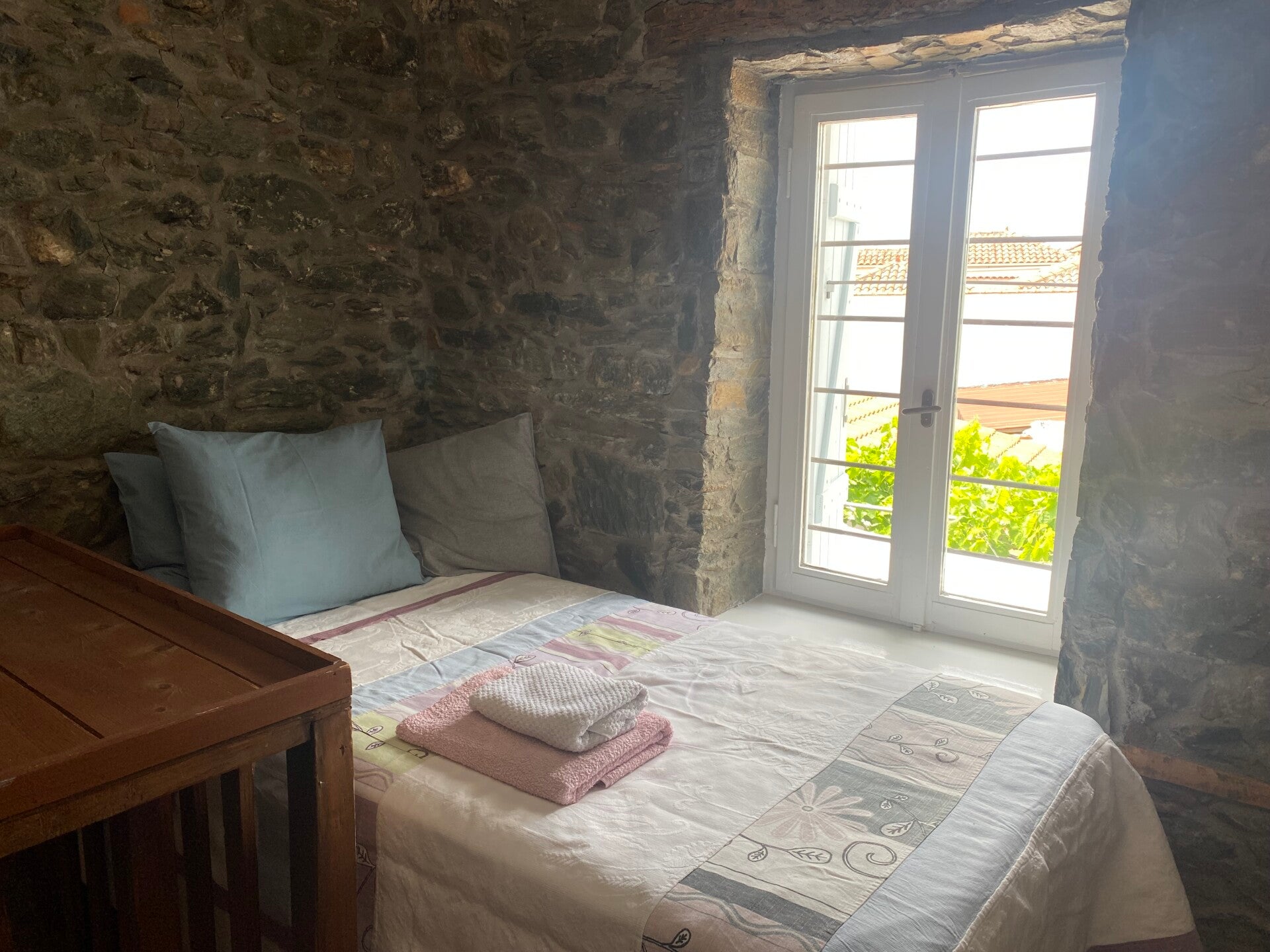 The second bedroom upstairs has two wide 110 cm single beds. Is is the only bedroom without air conditioning (for practical and aesthetic reasons we cannot put a unit on the facade of The Old Stone House), however there is a very good ceiling fan and should it be needed a free standing fan can be provided on request.
