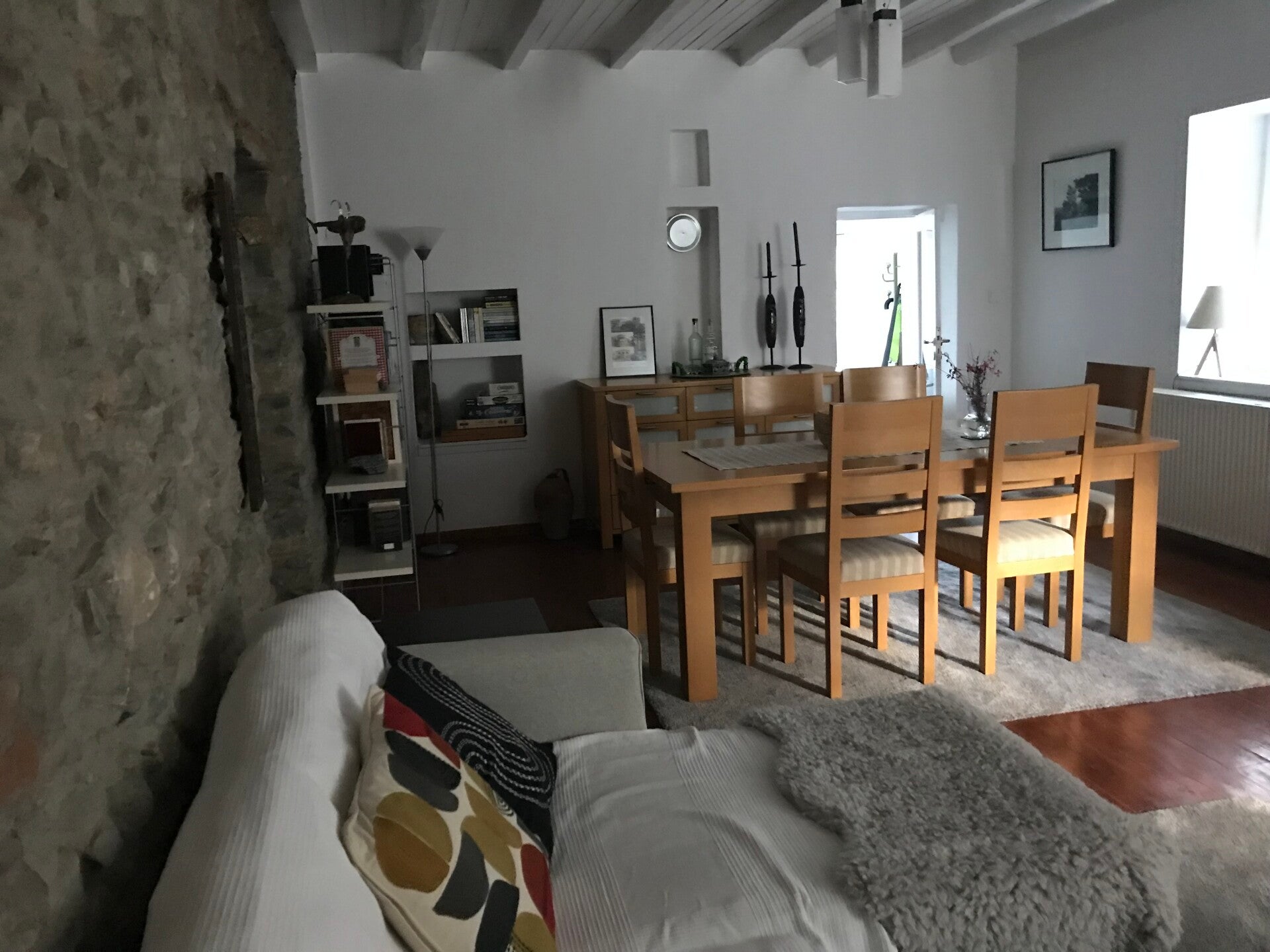 The Living Room has comfortable sofas, a large dining table, TV and music systems and a wonderful wood burning stove. Even though the house has central heating there is nothing better than a stove for those cosy cooler nights.