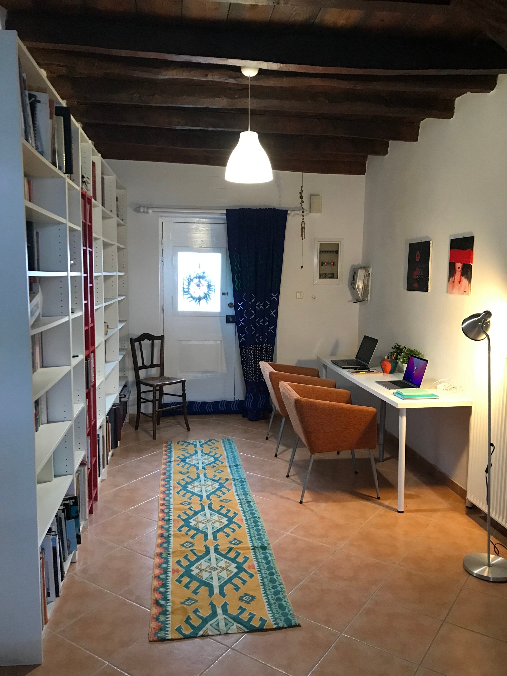 The large entrance hall welcomes you with a dedicated double workspace and a library of books.