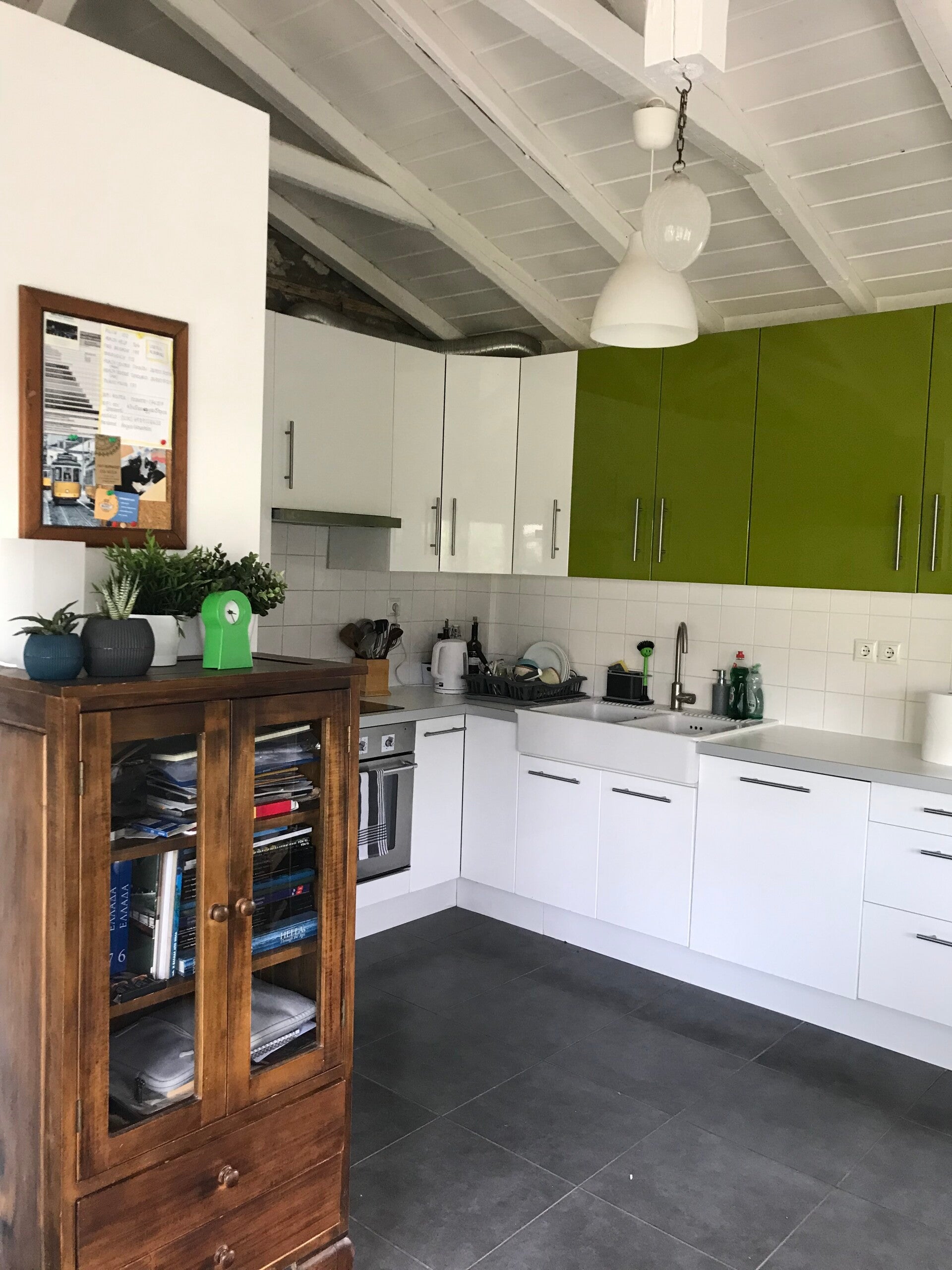 The kitchen is our favourite space, it's windows look out over the wonderful garden while the door opens directly onto the courtyard which has outdoor dining table and chairs. It is fully equipped with dish washer, microwave, coffee machine and a wood burning stove with a small oven.
